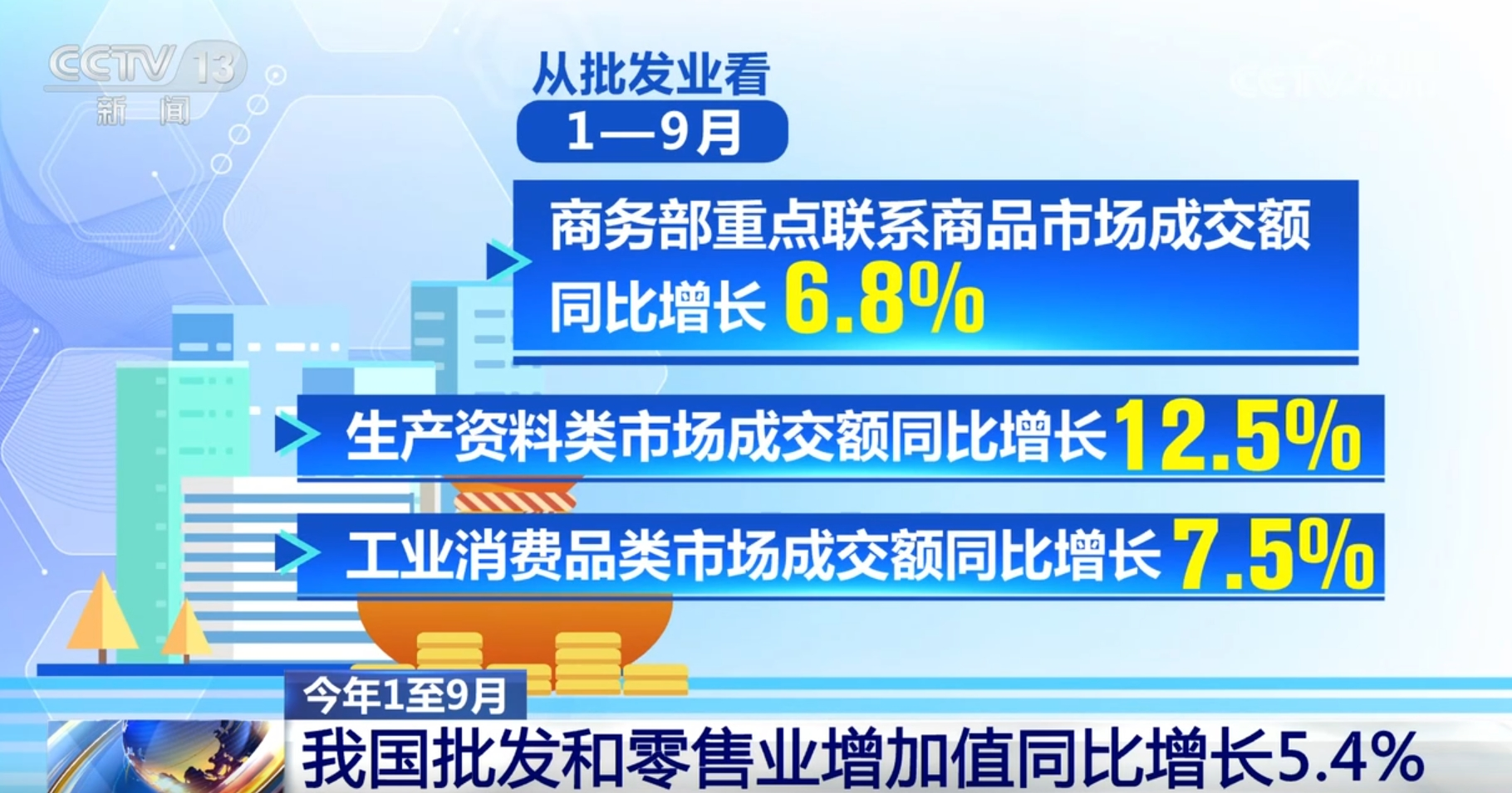 1—9月,批发和零售业增加值9.4万亿元,同比增长5.4%,占GDP比重为9.87%,批零市场运行平稳,多数业态保持增长。从批发业看,1—9月,商务部重点联系商品市场成交额同比增长6.8%,其中生产资料类、工业消费品类市场成交额同比分别增长12.5%、7.5%。从零售业看,1—9月,限额以上零售业单位中,便利店、专业店、超市零售额保持增长态势,同比分别增长4.7%、4.0%、2.4%。